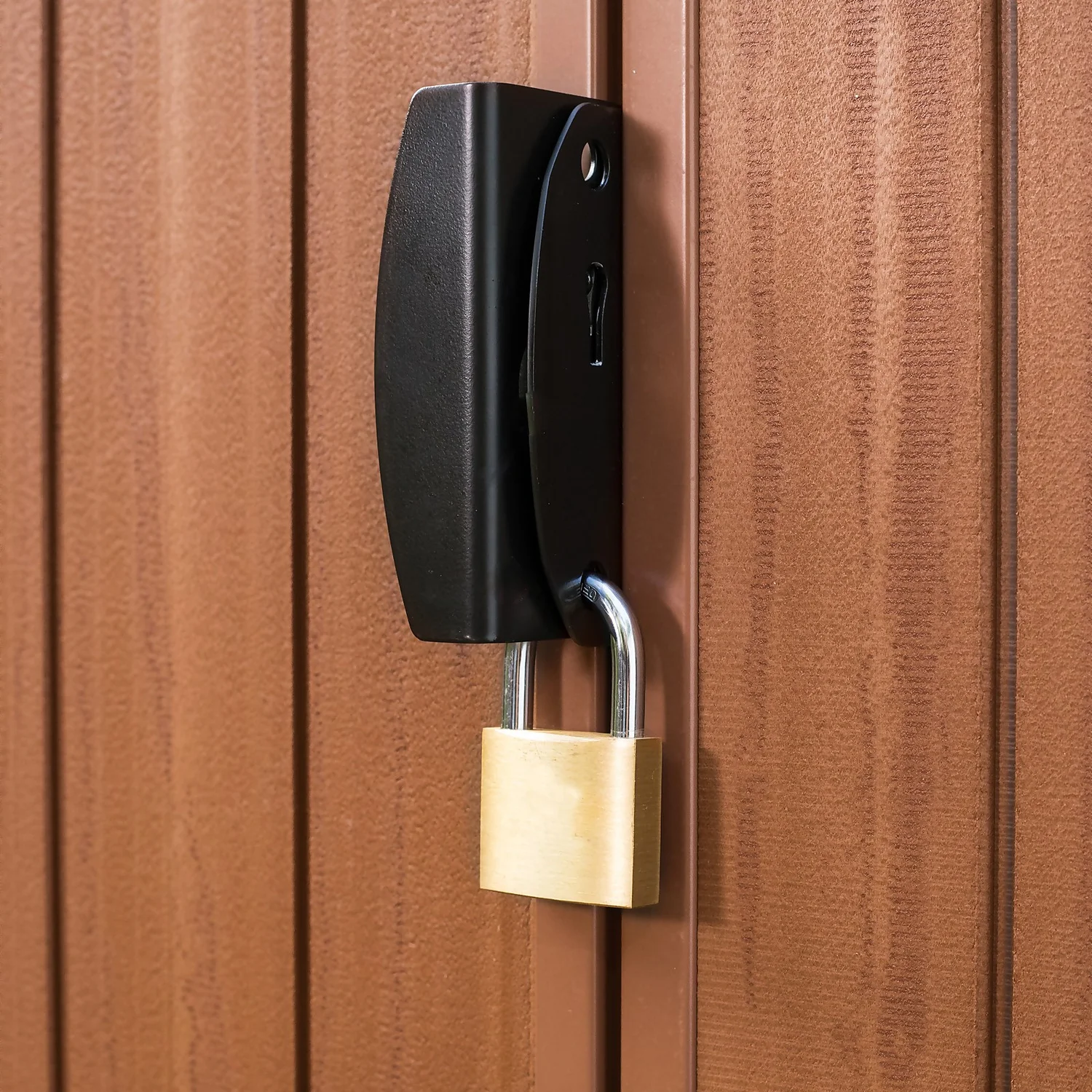- Heavy duty floor panel with tongue and groove panels for easy assembly and lock hasp for additional security