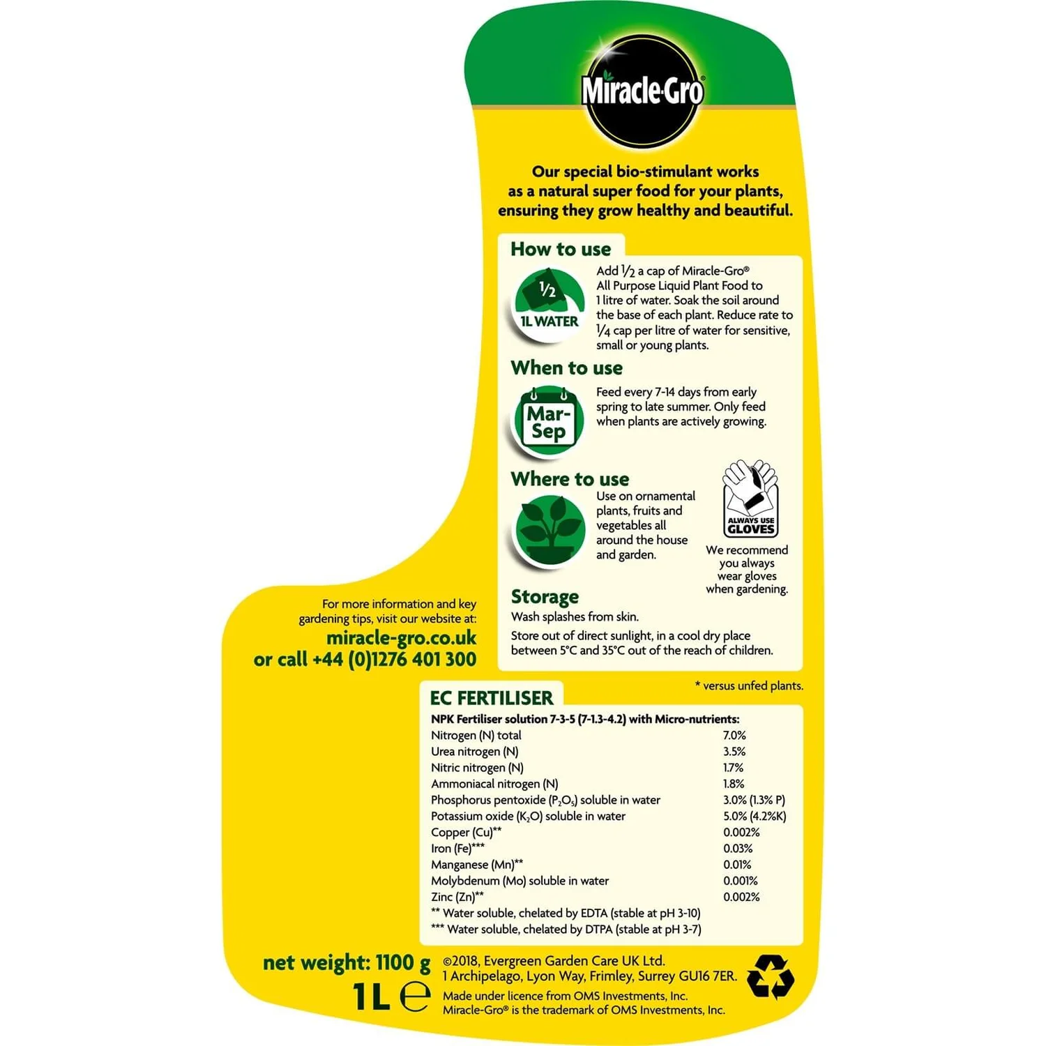 Miracle-Gro All Purpose Concentrated Liquid Plant Food has a unique formulation that now contains a natural growth stimulant to improve growth and yield. It is the perfect feed for flowering and foliage plants and pots, containers and hanging baskets. It can be used all around the garden and on houseplants, and can be applied either as a root or foliage feed. Regular feeding will produce bigger plants with noticeably more blooms.