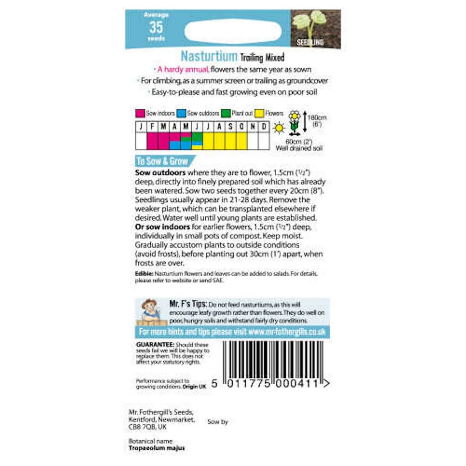 Nasturtium Trailing Mixed (Tropaeolum Majus) is a bright easy to grow colourful mix of vigorous climbing or trailing plants. Ideal for ground cover borders beds and patio pots.