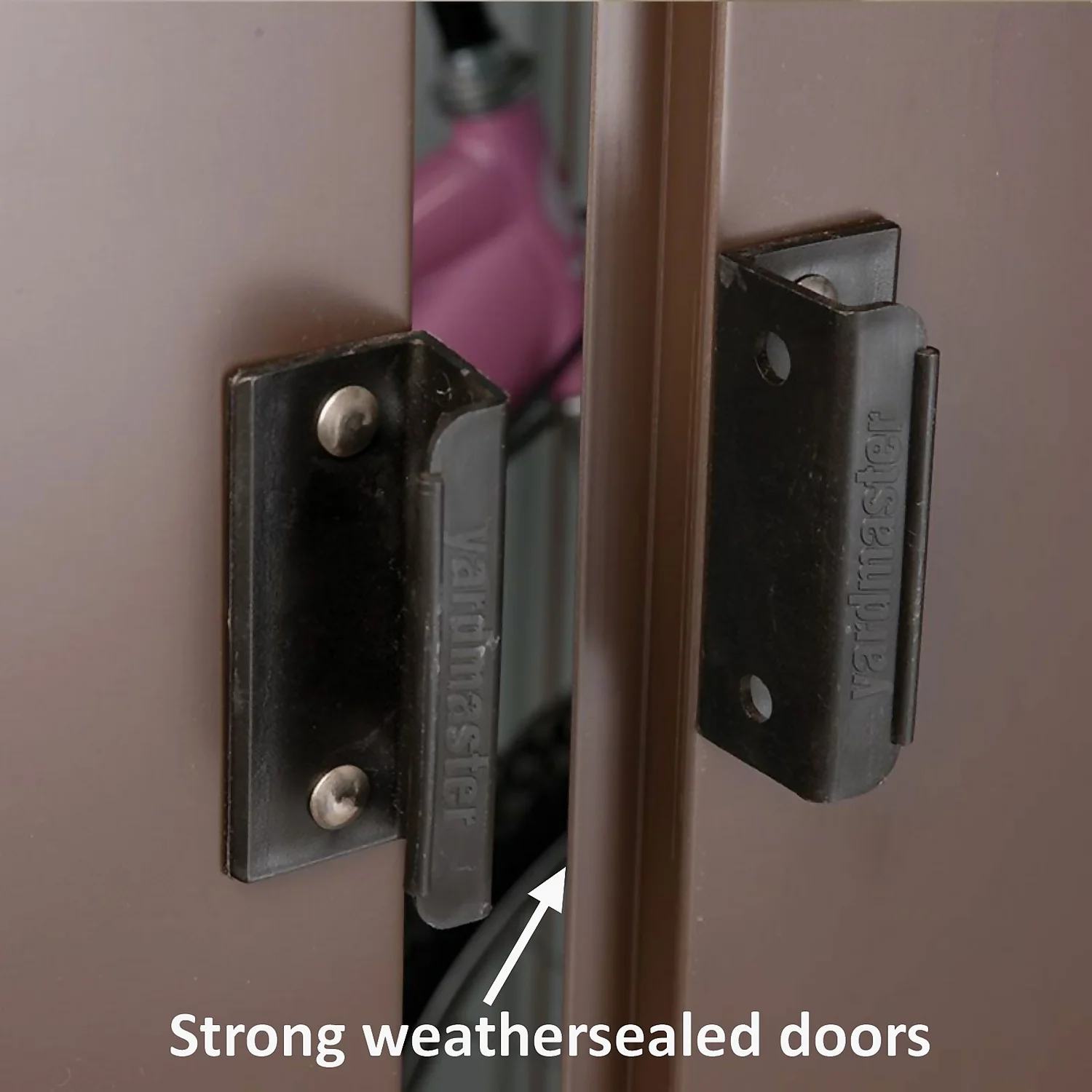 The Yardmaster Woodgrain metal shed 8ft x 6ft & Floor Frame has double sliding doors and wood effect cladding which blends into garden settings. Floor surface material is not included (image for illustrative purposes only).